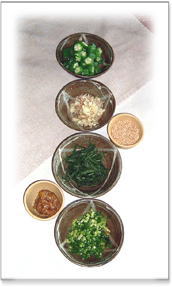 酒蒸ししたささみと茹でた小松菜を 胡麻和え(ごま油・白ゴマ・砂糖) したもの オクラ・みょうが・のり・万能ネギ・・・ 薬味をタップリといれて うどんをつるつる・・・っと。 |