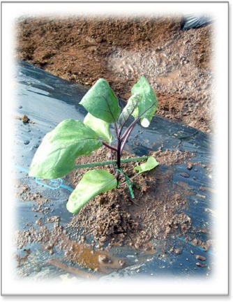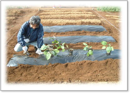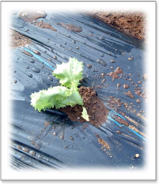 トマト・なす・レタスの畝には、 虫除け、温度確保の為、マルチビニールをかけました |