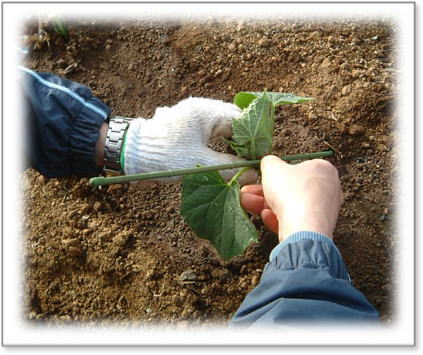 風に負けないように、添木をします。 1つ1つ丁寧に、「元気で育ってね」と祈りながら・・・ きゅうり ミニトマト |