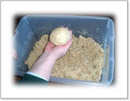 野球ボールよりも一回り 大き目ぐらいの「団子」を作ります。 |