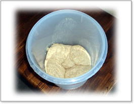 | こうして発酵するまでひたすら待ちます。 送ってくださるお味噌屋さんの話では、 味噌は寒いところを嫌がるそうで、家の中で一番温かいところ(我が家は台所)、に置いておくのが良いそうです。 12月仕込みは5月初旬ごろ、6月仕込みは10月初旬ごろ食べごろになりますが、 その時の気温などによって、出来上がりの時期や味がかなり違います。 発酵が進むと、味噌は真っ赤(茶色)になります。 私は、発酵の浅いものが好きなので、いい具合の時に、タッパーに小分けして、冷蔵庫に移します。 こうすることで発酵をほぼ止め、お好みの状態で保存することができます。 |