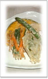 | 野菜の天ぷら かぼちゃ・グリーンアスパラ・玉ねぎ・ はす・人参とインゲン |