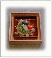 湯葉の巻物 魚と山芋のすり身を湯葉で巻いて・・・ はすの梅酢和え 梅肉をたっぷりと・・・ くりきんとん さつまいもは甘みを控えて・・・ |