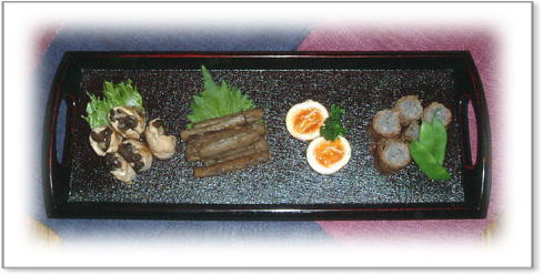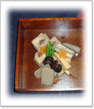 *かまぼこ・伊達巻 やっぱり、今年も生協で・・・ 器は2006.11に長野安曇野「nagi」で買い求めた 阿久津真希さんのカッティングボード シンプルで優しい。 |