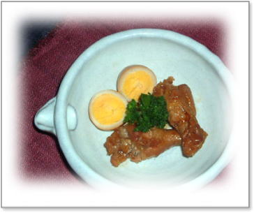 *チキンのマーマレード煮 醤油とマーマレードで味付けした簡単なチキン。 ゆで卵もたれに漬けて・・・ 添えのブロッコリーはMY畑にて収穫 |