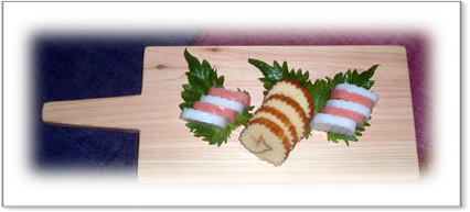 *信田まき 今年も、定番。 娘が作りました。 心には人参・たまねぎを・・・ さやインゲンを添えて |