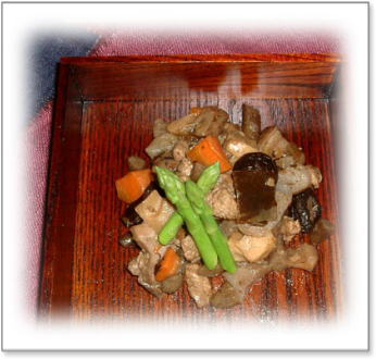 *筑前煮 今年は娘が作りました。 鶏肉・ごぼう・はす・にんじん・たけのこ・干ししいたけ・ そして手作りこんにゃくで煮込みました。 アスパラガスを添えて・・・ |