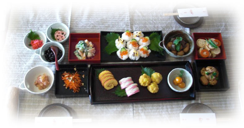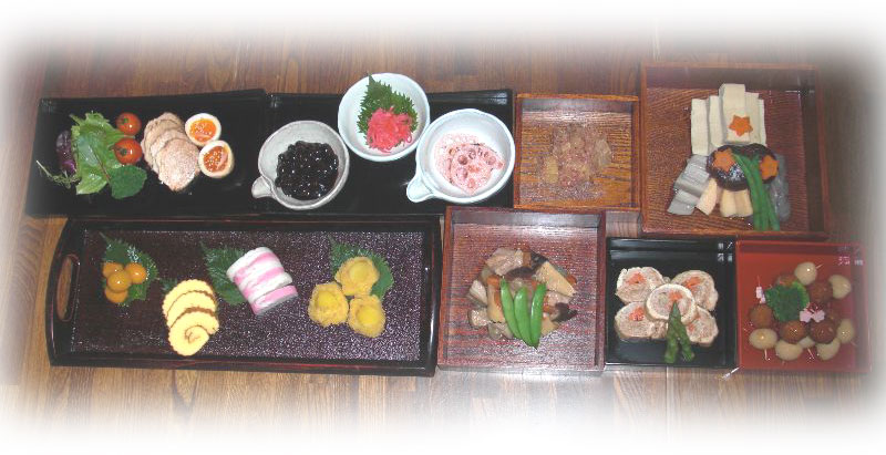 場面左上より *煮豚と茹で卵 *黒豆 *紅大根のなます *はすの梅酢漬け *数の子の鰹節和え *高野豆腐と野菜煮 画面左下より *キンカン甜菜糖煮 *伊達巻/かまぼこ *栗きんとん *筑前煮 *信田巻き *ジャガイモ入り肉団子とウズラあんかけ |