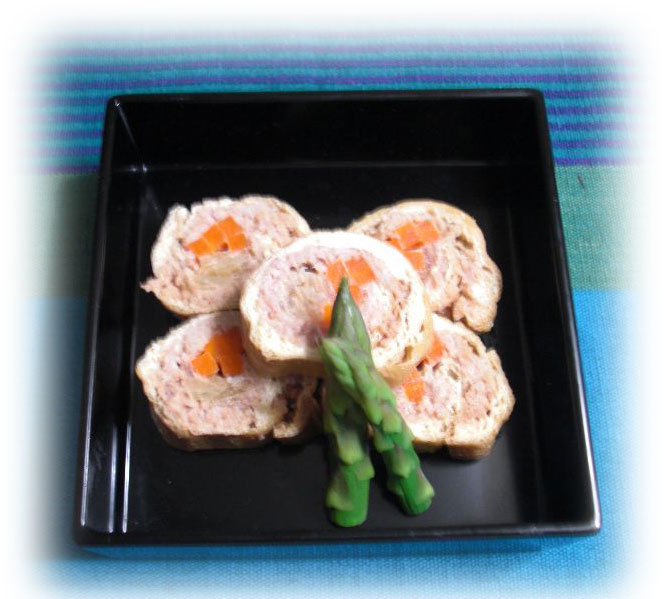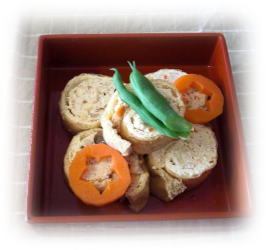 豆腐信田巻き トリヒキに豆腐にシメジに人参のみじん切りを入れてクルクル巻いて 白だしで煮ただけのシンプルな一品 |
