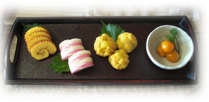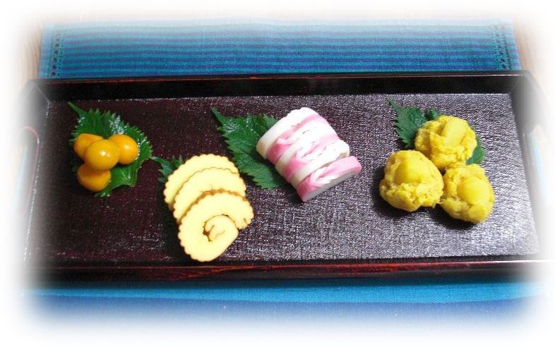 おせち料理らしく 伊達巻/かまぼこ/栗きんとん/キンカン煮 |