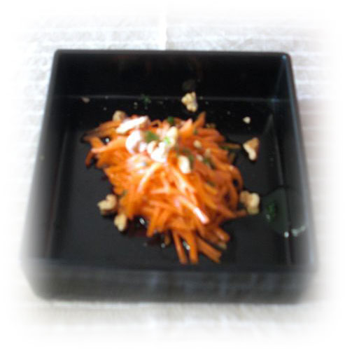人参のイタリアンサラダ 千切り人参に、手づくりドレッシングとくるみを散らして・・・ (オリーブオイル/バルサミコ酢/レモン果汁/ネーブル果汁/塩、コショウ/はちみつ) |