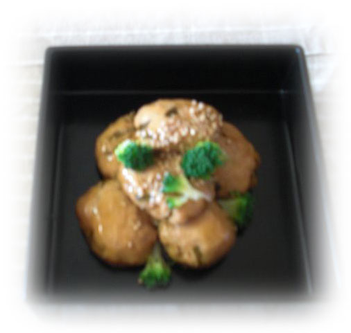 ニラ入りつくね団子 ニラをたっぷりいれたつくね団子 醤油味でとろみをつけて、ブロッコリーを散らして・・・ |
