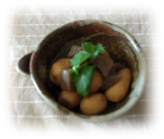 里芋と蒟蒻煮 干ししいたけの戻し汁をたっぷり使って甘辛く煮込みました、 |
