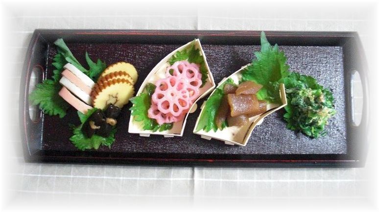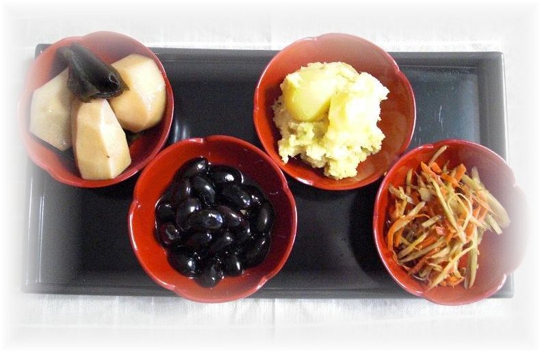 画面左上段より *煮豚と茹で卵 *信田巻き/油揚げ野菜巻き(柚子こしょう味) *筑前煮 画面左中段より *ミートボール(トマトソース) *かまぼこ/伊達巻 *はすの梅酢漬け *数の子の鰹節和え *菜花胡麻和え *高野豆腐煮(筍、はす、人参、こんにゃく、干し椎茸、スナップインゲン) 画面左下段より *里芋煮 *黒豆 *栗きんとん *きんぴら *田作り |