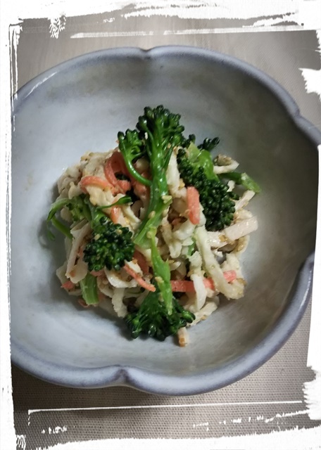 切り干し大根のサラダ 水で戻した切り干し大根を人参、ブロッコリーと共に マヨネーズであるだけ |