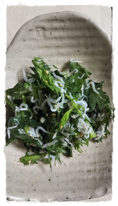 春菊とシラスのサラダ 春菊とシラスをごま油とお塩で和えるだけ |