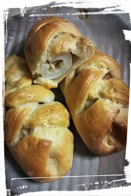 ちくわパン ちくわを縦に半分に切り、そこにツナマヨネーズをはさみ パン生地で包んでオーブンへ |