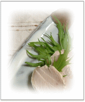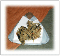![]() シメジ、しいたけ、舞茸など たくさんのきのこと地粉をしょうゆ味で混ぜあわせ、 フライパンでこんがりと焼く。 くたくた煮たカブをミキサーで撹拌し、 コンソメ味でポタージュに。 仕上げに茹でたカブの葉を入れる |
