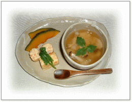 ![]() アツアツの揚げたてがんもと味噌汁・・・ 美味しい ![]() 摩り下ろしたレンコンに貝柱缶詰めとシメジ、 しょうがを和え、レンジで火を通し、 白だしをかける 蒸しかぼちゃ 豆腐と野菜の湯葉包み ほうれん草添え |