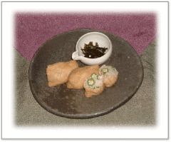 おくら入りおいなりさん 付け合せの片口の中には、油揚げを煮込んだ時の 出し昆布を千切りにしたものが入っています。 この昆布がまたたまらなく美味しいのです!! |