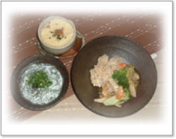 「安曇野豆腐の冷豚しゃぶしゃぶ」 万能ねぎとごまだれで・・・ 「じゃがいもとゴマ入り肉団子」 過去に買い求めた阿久津真希氏の器たちと一緒に・・・ 「野菜あんかけと茶碗蒸し 春雨スープ」 たっぷりの野菜と玄米 ドライトマトときのこと大根葉のスパゲティ にんにく・しいたけ・しめぎをたっぷりと入れ、 仕上げに「大根の葉」もたっぷりと・・・ 〜そば粉入りうどん風スパゲティ〜という感じ 大根と油揚と万能ねぎの味噌汁 |