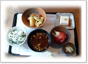 「季節の膳セット(5月)」 ![]() 若布ご飯 赤だし味噌汁(キャベツ・海草) トマトとカブのサラダ ごま豆腐 春巻き(じゃがいもとうど)とうどとしし唐の天ぷら 漬物と梅干 |