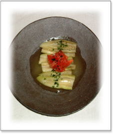「プチヴェールとトマトのサラダ」 ![]() 「豚肉の野菜巻き焼き」 (はす・大葉・人参) ![]() |
