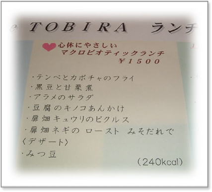 | 11/2 ランチ キュイジーヌ TOBIRA http://www.tobira-group.com/ 松本市中町2-5-15 最近、マクロビランチをはじめたと、教えていただき、 早々に行って見ました。 メニュー ![]() お店にあったチラシ スキャナしたので、裏面が見えてしまって、ごめんなさい! ![]() ![]() |