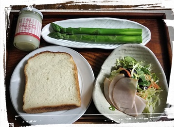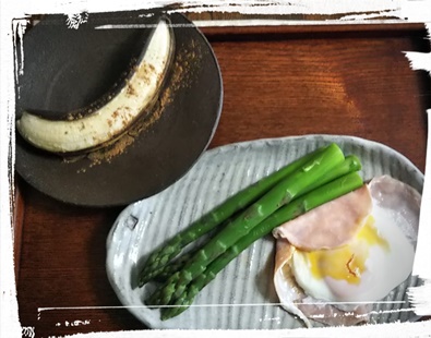 朝)ハムエッグ/茹でアスパラガス/焼きバナナ ※北海道の姉がアスパラを送ってくれました。 シンプルに、さっとゆでてそのまま・・・ 贅沢な幸せな麻ですヽ(^。^)ノ アスパラは、根元の部分をピューラで少しだけむいて、 1分ちょっと、塩茹でします。 固めに茹でて、ぼりぼりと頂くのが 最高の美味しい食べ方でしょうかヽ(^。^)ノ ※焼きバナナにはレモングラス入りハチミツとシナモンを・・・ |