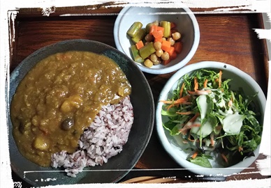 夜)野菜カレー(小分けしてあったストックを解凍)/サラダ/はっさく 時々食べたくなるものの1つにカレーがあります。 動物性が苦手な私なので、野菜のみ。 たくさん作って、小分けして冷凍庫へ。 ボリュームたっぷりで満足、満足(^^♪ |