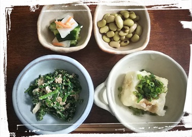 朝)春巻き/漬物/タケノコ甘辛煮味噌汁 ※冷めた春巻きも美味しいです。 あとは、常備菜。 お味噌汁には、万能ねぎとゴマおからをたっぷり入れて・・・ |