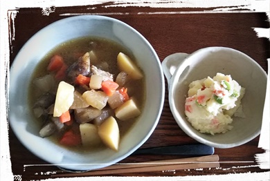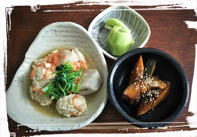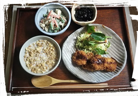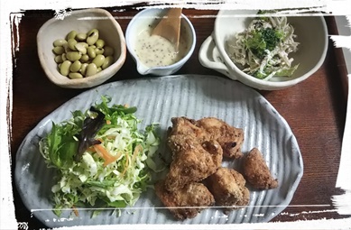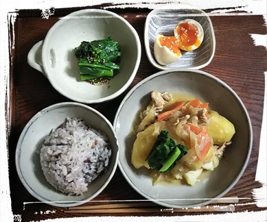 夜)つくね団子とサトイモとタケノコ煮/いかの竜田揚げマリネ/漬物/茶碗蒸し ※茶碗蒸しは、時々食べたくなるものの一つです。 ※漬物は、カブとキュウリと人参を塩麹とらっきょう酢で漬けました。 |