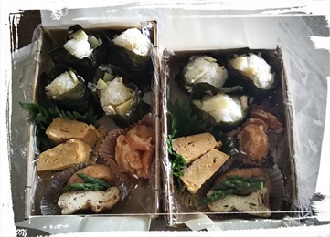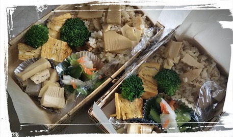 昼)筍おむすび弁当 エビの唐揚げ、厚焼き玉子、がんも煮 ※たまには、お弁当のランチも良いものだ(^^♪ |