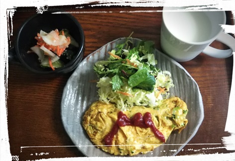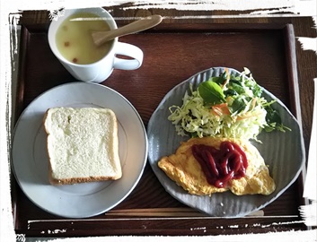 昼)食パン/オムレツ/サラダ/コーンスープ(生協インスタント) ※オムレツのケチャップは、一応「ハート」を描いたつもり・・・(笑) ※サラダの人参は、昨日の頂き物 |