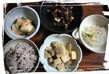 夜)ひじき煮/春雨サラダ/タケノコこんにゃく煮/漬物 ※冷蔵庫にある常備菜のみの晩ご飯です。 こういう晩ご飯は毎日でもOKです(^^♪ |