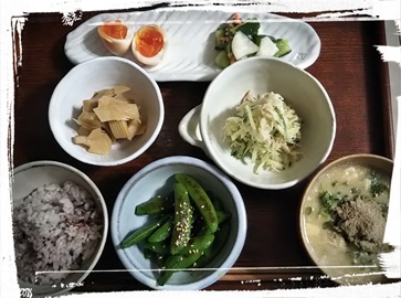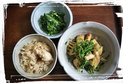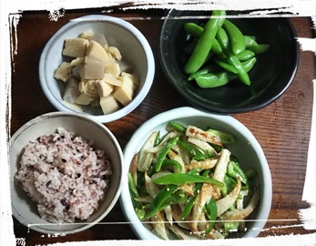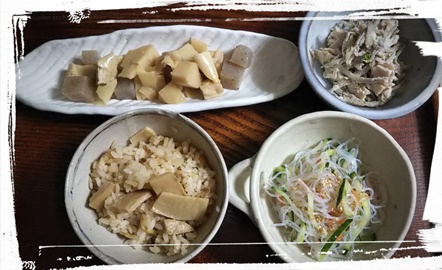 夜)タケノコご飯/春雨サラダ/筍と油揚げとこんにゃく煮/ゴボウと蒸し鶏のサラダ ※ゴボウと蒸し鶏のサラダには、「ごまおから」をたっぷりと入れいます。 ※筍と油揚げとこんにゃく煮は、 崎陽軒の焼売弁当に入っている筍煮を真似てみました。 |