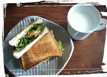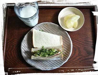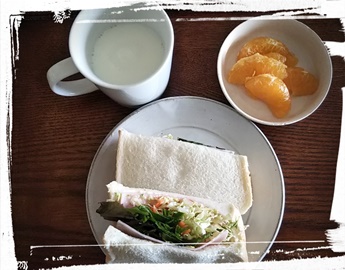 朝)野菜ハムサンド/牛乳/甘夏 ※キャベツの千切り、ベビーリーフ、人参の生野菜をたっぷりと挟んだサンドイッチは 朝から元気がでます(^_-)-☆ ※甘夏は、時間のある時に、TVを見ながら皮むきして 余りのすっぱさに、甜菜糖を振りかけてタッパで冷蔵庫へ |