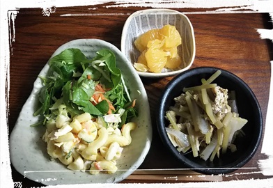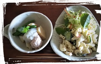 昼)つくね団子とサトイモとタケノコ煮/サラダ・マカロニサラダ ※我が家のマカロニサラダには、ジャガイモも入れます。 ほくほくして美味しくなります。 |