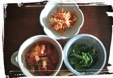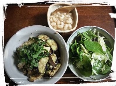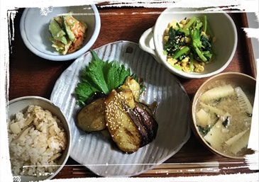 夜)焼きナス(生姜タレ)/即席漬物/小松菜のおひたし ※茄子をじっくり焼いて、仕上げに生姜タレをじゅじゅじゅ〜〜っと(^_-)-☆ 大葉で包んで食べると美味しい!!ヽ(^。^)ノ ※小松菜のおひたしには、天かすを入れてボリュームUP(笑) ※即席漬物は、冷蔵庫の残り物(キャベツ、ニンジン、キュウリ) |