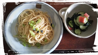 昼)和風パスタ(永谷園の松茸の吸い物利用)/酢の物 ※パスタ気分 そして、 和風味気分 よって、永谷園の「松茸のお吸い物」の力を借りて、 小松菜の根の部分を添えて(^_-)-☆ |