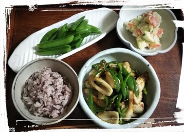 夜)ちくわとピーマン炒め/タケノコこんにゃく煮/スナップエンドウサラダ ※娘が教えてくれたちくわとピーマン炒めは、塩麴とゴマだけ。 美味しいですヽ(^。^)ノ ※スナップエンドウは、昨日収穫したシャキッシャキの美味しさです。 |