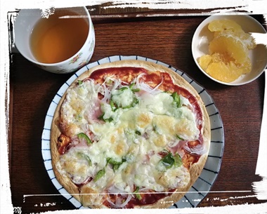 朝)ピザ/甘夏 ※ピザの生地は、市販のもの 玉ねぎ、ピーマン、ハムだけのシンプルなもの かりかりの薄い生地パリパリして美味しかった(^^)v |