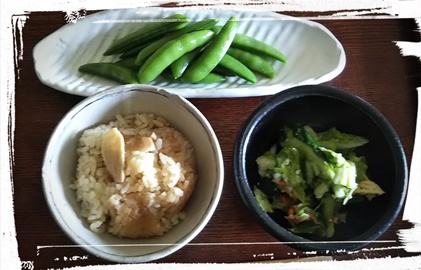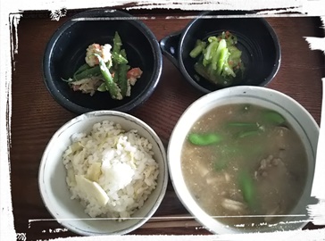 昼)筍ご飯/漬物/茹でスナップエンドウ ※夏のようなお日様が照り注ぎ、さっぱりとしたお昼ご飯に(^^♪ |