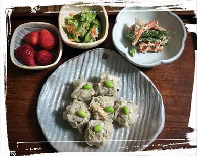 夜)筍り焼売/漬物/いんげんと人参の蒸し鶏胡麻和え/イチゴ ※筍をたっぷり入れて、焼売を・・・ ※いつもの簡単鶏ハムに茹でた人参とインゲンをあえて、胡麻和え 野菜も果物も、「かため」を好む私ですが、 最近は、人参とインゲンは、柔らか目に茹でるのが、今のお気に入り(^o^) ※今季最後の苺かしら・・・ 生協さんの苺は、予想より大きな粒でした。 |