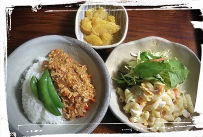 夜)ドライカレー/マカロニサラダ/甘夏 ※ドライカレーは昨晩の焼売のひき肉の残りと、玉ねぎ、カラーピーマン(黄色/赤)、 キノコのみじん切りをたっぷり入れて。 新玉ねぎのお蔭で、本当に甘くて美味しいドライカレーになりました。 ※マカロニサラダには、茹で卵も入れて、優しい味になりました(^^♪ |