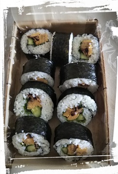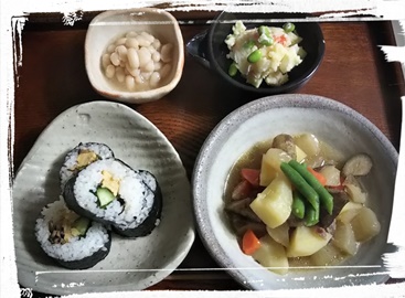 昼)太巻き/紅ショウガ/フキとタケノコと油揚げの煮物 ※太巻きは、厚焼き玉子・キュウリ・干し椎茸煮・大葉という野菜ばかり。 ※紅ショウガも新生姜で作りました。 すし飯には、やはり、紅ショウガですね(^_-)-☆ |