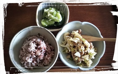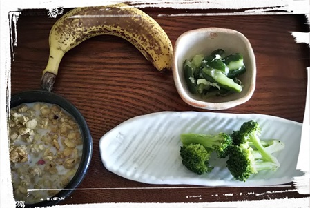 朝)グラノーラ/きゅうりの漬物/茹でブロッコリーオリーブオイル和え/バナナ ※今日は、6:45〜2時間 畑作業へ 朝早かったので、軽く・・・(^^♪ |