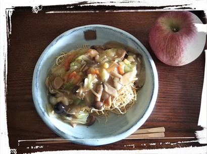 昼)キノコ皿うどん/リンゴ ※畑仕事の後は、シャワーを浴びて、直ぐに在宅勤務へ。 ※お昼ご飯は、かなりお腹が空いたので、 娘が送ってくれた「皿うどん」を 本当にキノコもたっぷり。 キャベツは乾燥が入っていて、お湯で戻してから使いました。 レトルト特有の味もなく、 麺も脂っこくなく、美味しかったです。 |