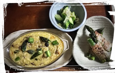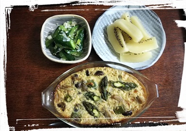 夜)アスパラ豚巻き/アスパラガスとキノコのキッシュ/キュウリ中華漬物 ※アスパラガスの豚バラ肉も相性いいですね。 肉が苦手な私ですが、しゃぶしゃぶ用の豚バラで。 ※アスパラガスときのこと新玉ねぎたっぷりのキッシュも 美味しかったです。 きのこは、しめじ、マイタケを。 新玉ねぎは、朝収穫したばかりのものを。 ※キュウリは、畑のお仲間からのお裾分け。 小ぶりの柔らかな、本当い美味しいキュウリでした。 長ネギをみじん切りにして、 ごま油、胡麻、塩こうじで和えただけですが 美味しかったですヽ(^。^)ノ なんと贅沢なことでしょう。 |