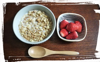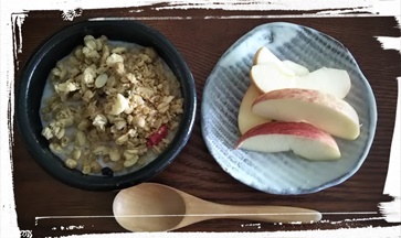 朝)グラノーラ/リンゴ ※今朝もグラノーラ気分(^_-)-☆ かりかりサクサクのグラノーラも 牛乳に包まれたしっとりグラノーラも どちらも、好みです(^o^) ※リンゴは、薄く切って、皮もいただきます。 |